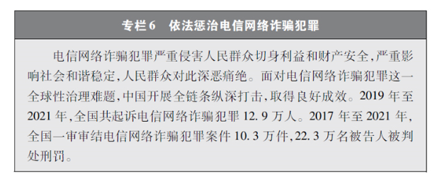 加大網(wǎng)絡(luò)犯罪懲治力度。隨著互聯(lián)網(wǎng)技術(shù)的快速發(fā)展,傳統(tǒng)犯罪加速向以互聯(lián)網(wǎng)為媒介的非接觸式犯罪轉(zhuǎn)變,電信網(wǎng)絡(luò)詐騙、網(wǎng)絡(luò)賭博、網(wǎng)絡(luò)淫穢色情等涉網(wǎng)違法犯罪多發(fā)。中國依法辦理新型網(wǎng)絡(luò)犯罪案件。連續(xù)多年開展“凈網(wǎng)行動”,嚴(yán)厲打擊群眾反映強(qiáng)烈的黑客攻擊破壞、侵犯公民個人信息等違法犯罪活動。持續(xù)推進(jìn)“云劍”“斷卡”“斷流”“拔釘”等專項行動,打擊套路貸、校園貸、“以房養(yǎng)老”、“投資養(yǎng)老”等電信網(wǎng)絡(luò)詐騙犯罪,依法懲處為電信網(wǎng)絡(luò)詐騙犯罪團(tuán)伙提供互聯(lián)網(wǎng)接入、域名注冊、服務(wù)器托管、移動互聯(lián)網(wǎng)應(yīng)用程序制作開發(fā)、網(wǎng)絡(luò)支付、引流推廣等服務(wù)支撐的黑灰產(chǎn)業(yè)。完善國家反詐大數(shù)據(jù)平臺和反詐移動互聯(lián)網(wǎng)應(yīng)用程序,建設(shè)國家涉詐黑樣本庫,完善快速止付凍結(jié)機(jī)制、涉詐資金返還機(jī)制。堅決打擊網(wǎng)絡(luò)賭博犯罪行為,從嚴(yán)治理網(wǎng)絡(luò)淫穢色情。網(wǎng)絡(luò)犯罪治理工作取得明顯成效,人民群眾安全感有效提升,社會更加和諧穩(wěn)定。
