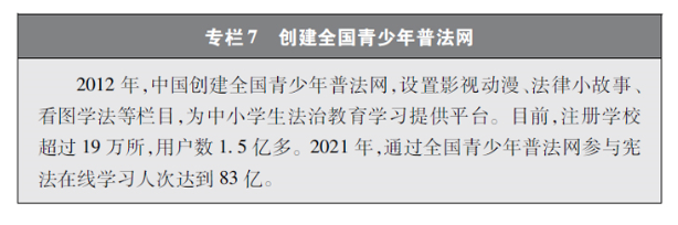 加強(qiáng)青少年網(wǎng)絡(luò)法治宣傳教育。青少年是祖國的未來、民族的希望。青少年網(wǎng)民在中國網(wǎng)民中的占比逐步增長。作為互聯(lián)網(wǎng)的“原住民”,青少年是網(wǎng)上學(xué)習(xí)、交流、生活最活躍的參與者、實踐者,其合法權(quán)益也更易受到網(wǎng)絡(luò)違法活動的侵害。中國從保護(hù)青少年網(wǎng)絡(luò)權(quán)益,促進(jìn)青少年健康成長、全面發(fā)展出發(fā),遵循青少年身心發(fā)展規(guī)律,貼近青少年學(xué)習(xí)生活實際,聚焦網(wǎng)絡(luò)沉迷、網(wǎng)絡(luò)欺凌、網(wǎng)絡(luò)淫穢色情信息等重點(diǎn)問題,通過普法微綜藝、兒童普法話劇、網(wǎng)絡(luò)普法故事廣播、網(wǎng)絡(luò)普法云課堂、學(xué)法用法知識競賽、法治副校長進(jìn)校園、編寫網(wǎng)絡(luò)普法讀本等生動活潑、豐富多彩的形式開展法治宣傳教育,逐步形成了政府、社會、學(xué)校、家庭相結(jié)合的法治宣傳教育格局,為提升青少年網(wǎng)民法治意識和網(wǎng)絡(luò)安全素養(yǎng)提供了全面保障。