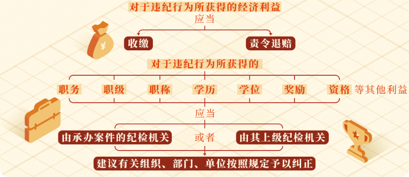 對于違紀(jì)行為所獲得的職務(wù)、職級、職稱、學(xué)歷、學(xué)位、獎勵、資格等其他利益,應(yīng)當(dāng)由承辦案件的紀(jì)檢機(jī)關(guān)或者由其上級紀(jì)檢機(jī)關(guān)建議有關(guān)組織、部門、單位按照規(guī)定予以糾正。