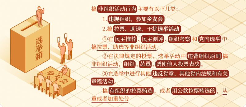 《中國(guó)共產(chǎn)黨紀(jì)律處分條例》第八十二條、第八十三條對(duì)搞非組織活動(dòng)行為列出負(fù)面清單,對(duì)違規(guī)組織、參加鄉(xiāng)友會(huì),以及搞拉票、助選、干擾選舉活動(dòng)作出處分規(guī)定。